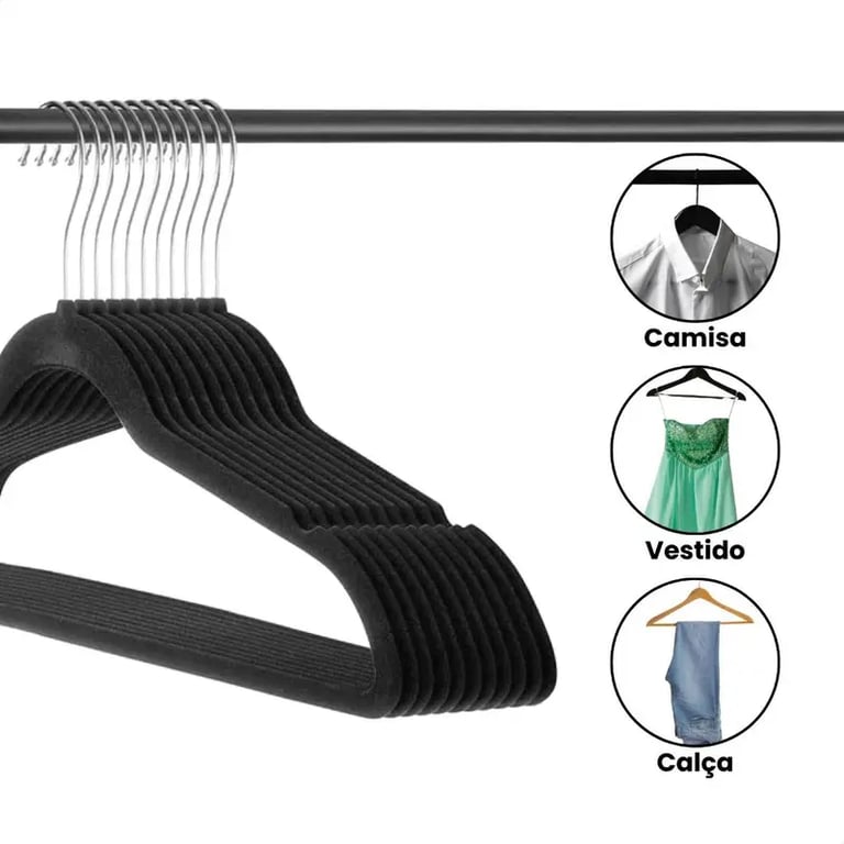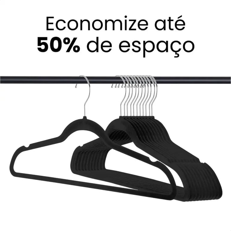 Kit Cabides Adulto Aveludado com tecnologia anti deslizante, para manter as roupas no local sem bagunça. Os cabides tem o gancho em aço com giro de 360° e corpo flexível com tecido de veludo que não marcam as roupas, e suportam até 4Kg por cabide.